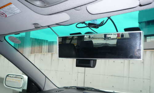 この車両の場合、ルームミラー裏側に取り付けることは可能でしたが、2cm〜3cmくらいルームミラー下から出ます。