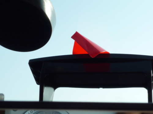 ルームミラー裏側付近のフロントガラスにドラドラ(DD-01)を仮止め(マスキングテープ、ビニールテープなどにて)します。